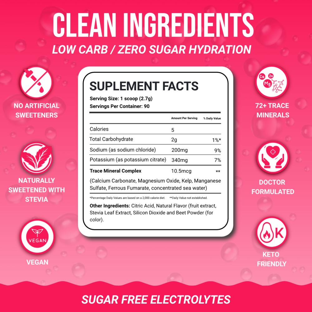 Sodium, Potassium, Calcium, Magnesium, Kelp, Manganese, Ferrous Fumarate, Concentrated Sea Water, Citric Acid, Silicon Dioxide, Natural Flavors (fruit extract), Stevia Leaf Extract, and Beet Powder (as color).